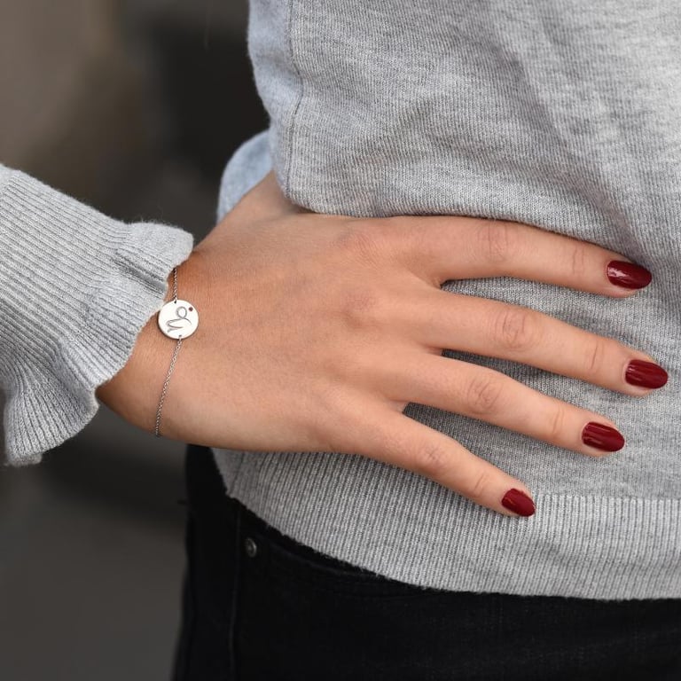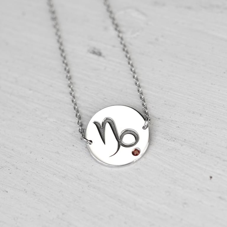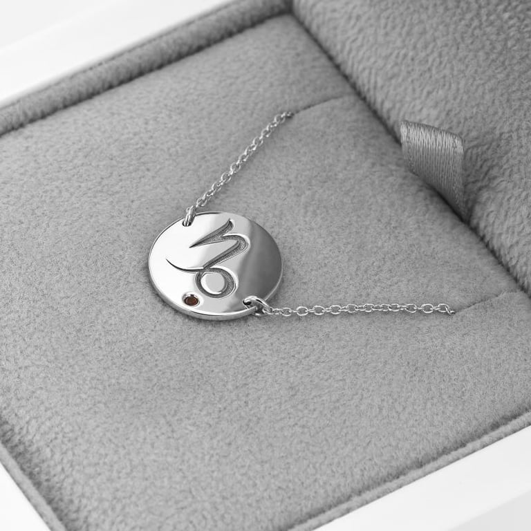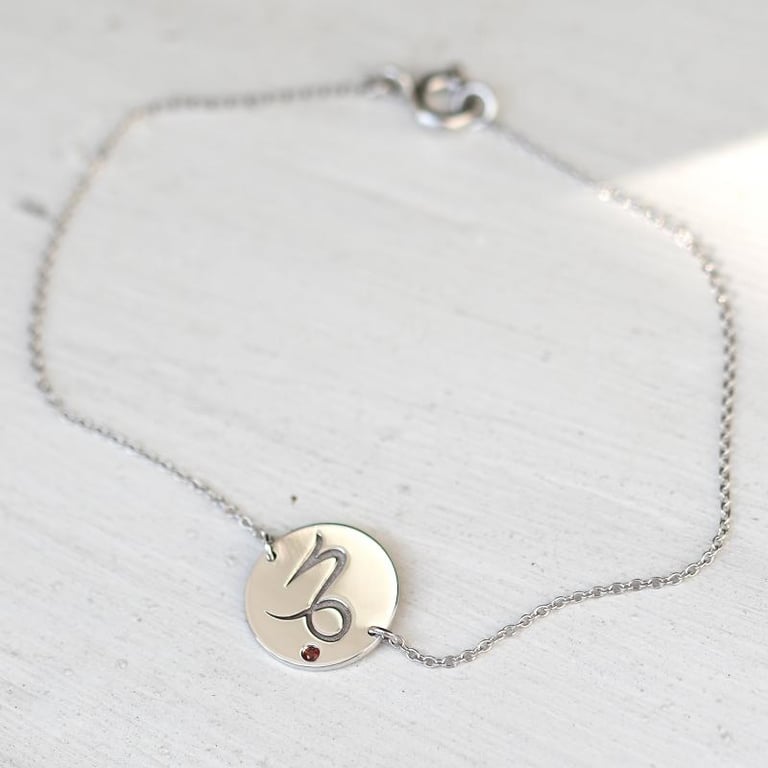 • das goldenes Armband ist mit dem Zeichen des Steinbocks und einem roten Granat verziert, dem Geburtsstein der genau so feurig ist, wie das Herzen des Sternzeichens