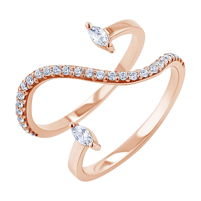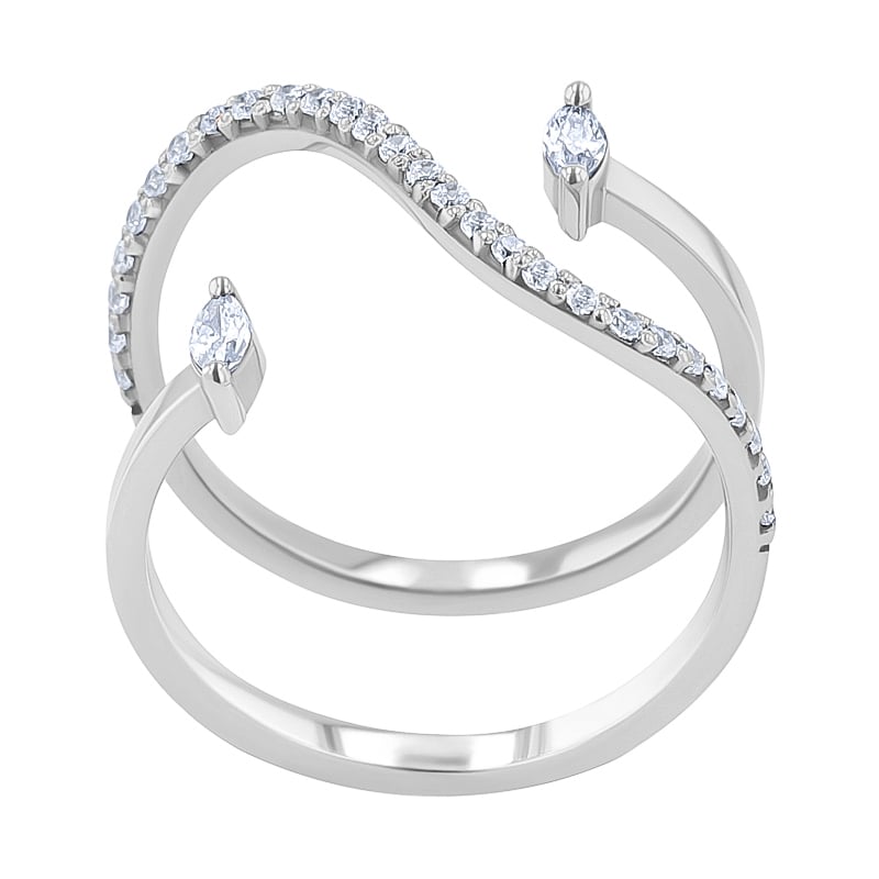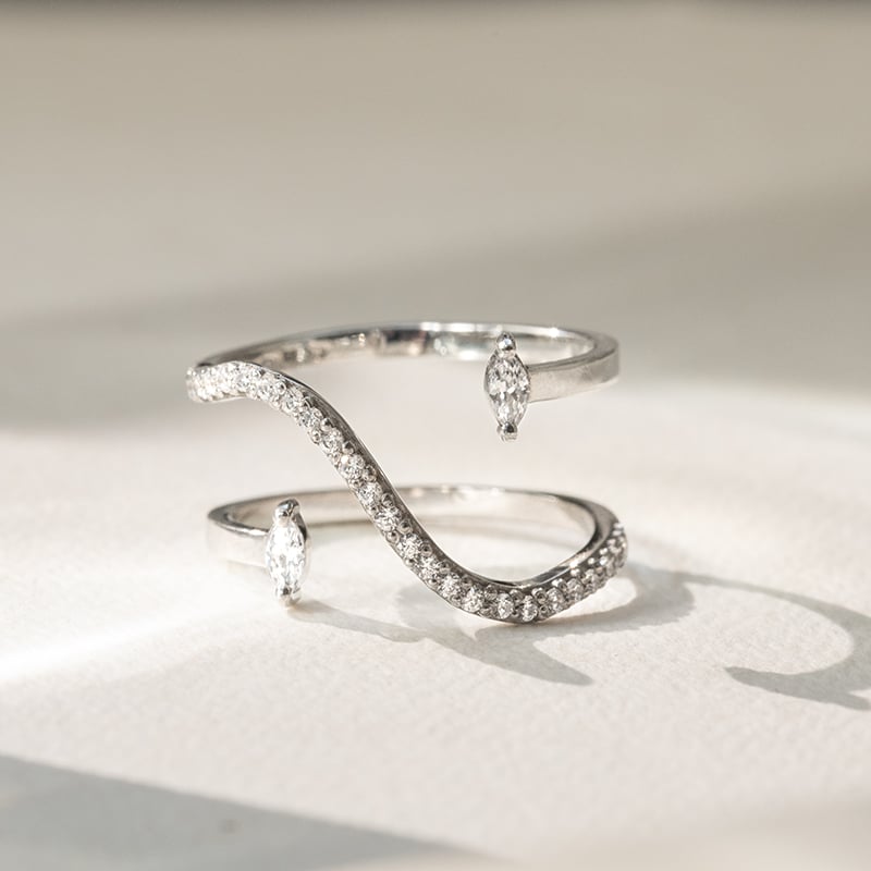 • zwei klare Moissanite in Marquise Form sind durch eine Reihe kleinerer Edelsteine getrennt, die anmutig an Ihrem Finger schweben