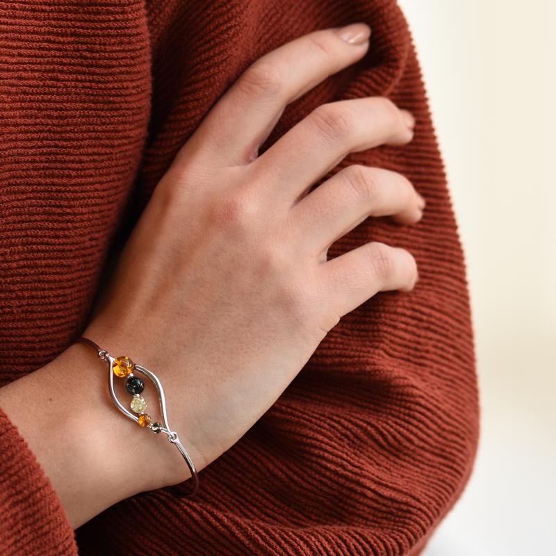 • bei diesem Silberarmband fällt der Blick sofort auf die verschiedenfarbenen Bernsteincabochons
