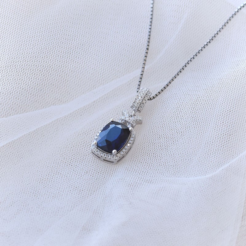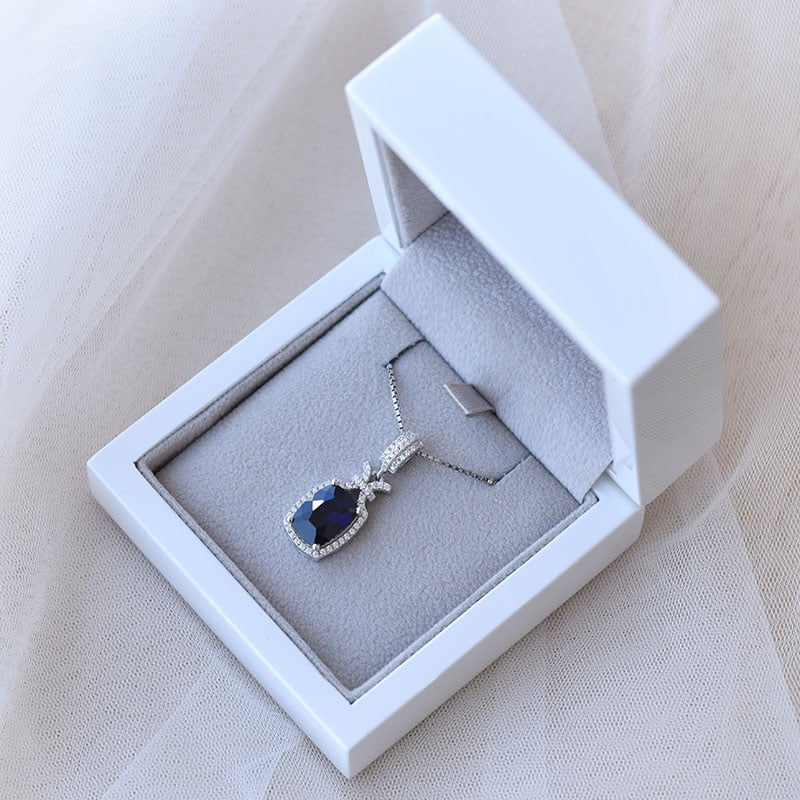 • der Saphir im Kissenschliff ist von Zirkonia umgeben und die Schlaufe des Anhängers erinnert an eine elegante Maschenform