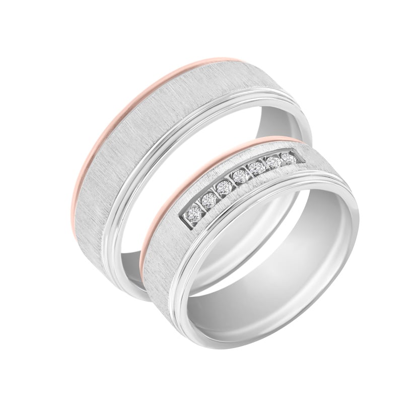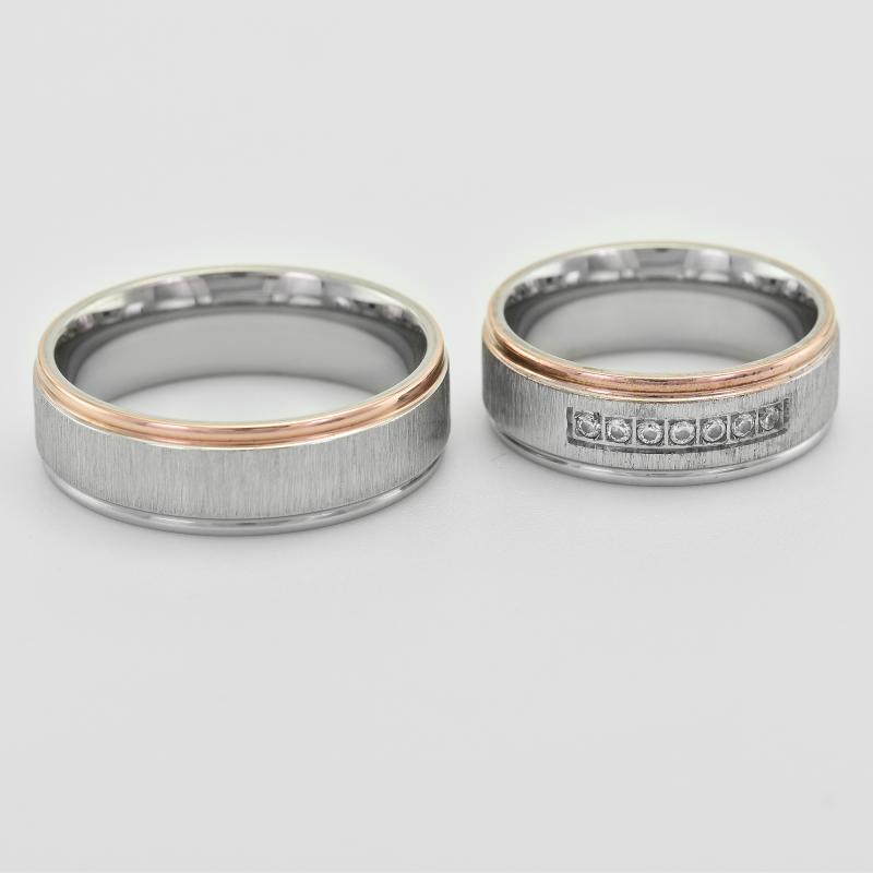 • einer der zarten Streifen ist andersfarbig und in den kleineren Ring wurden 7 Diamanten eingelassen