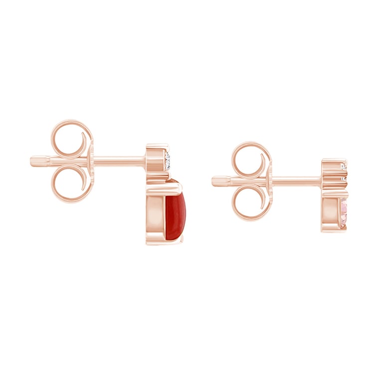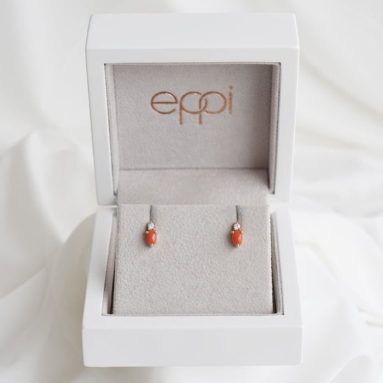 • den kleineren Ohrring schmückt ein rosa Morganit und ein Diamant und der größere ist mit einem Diamanten und einer roten Koralle besetzt