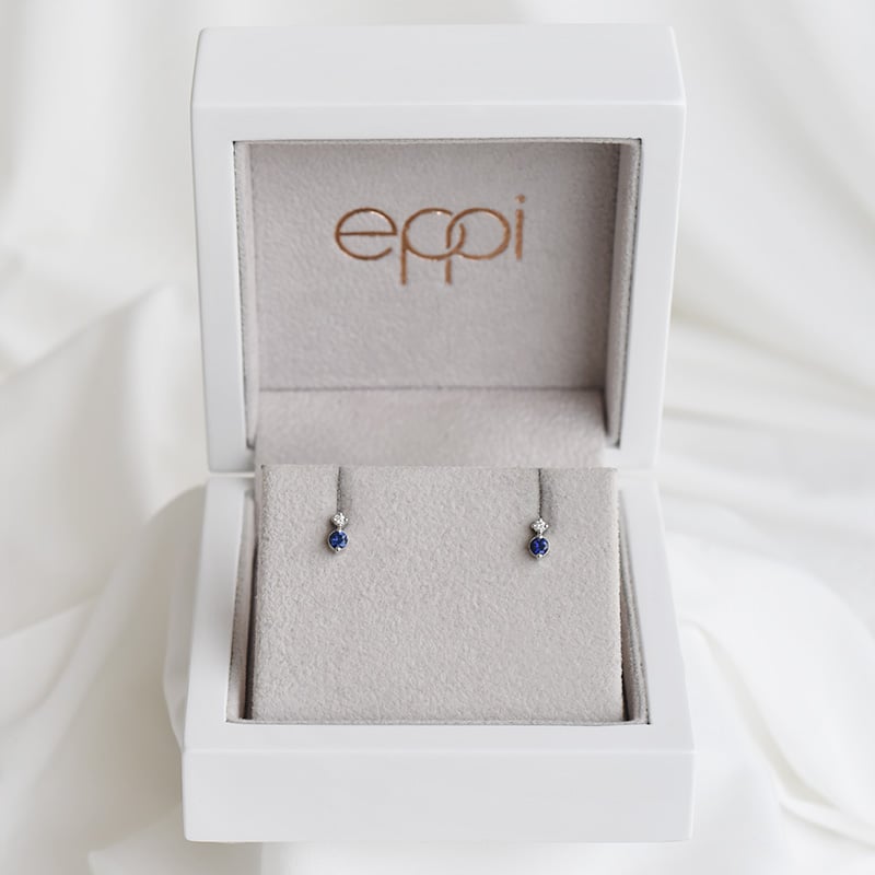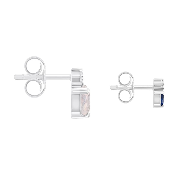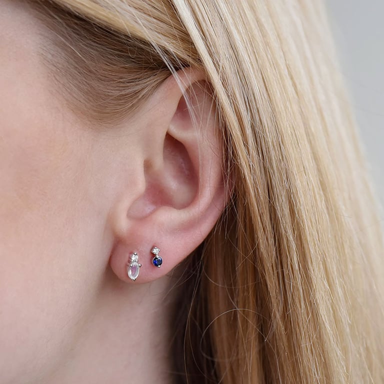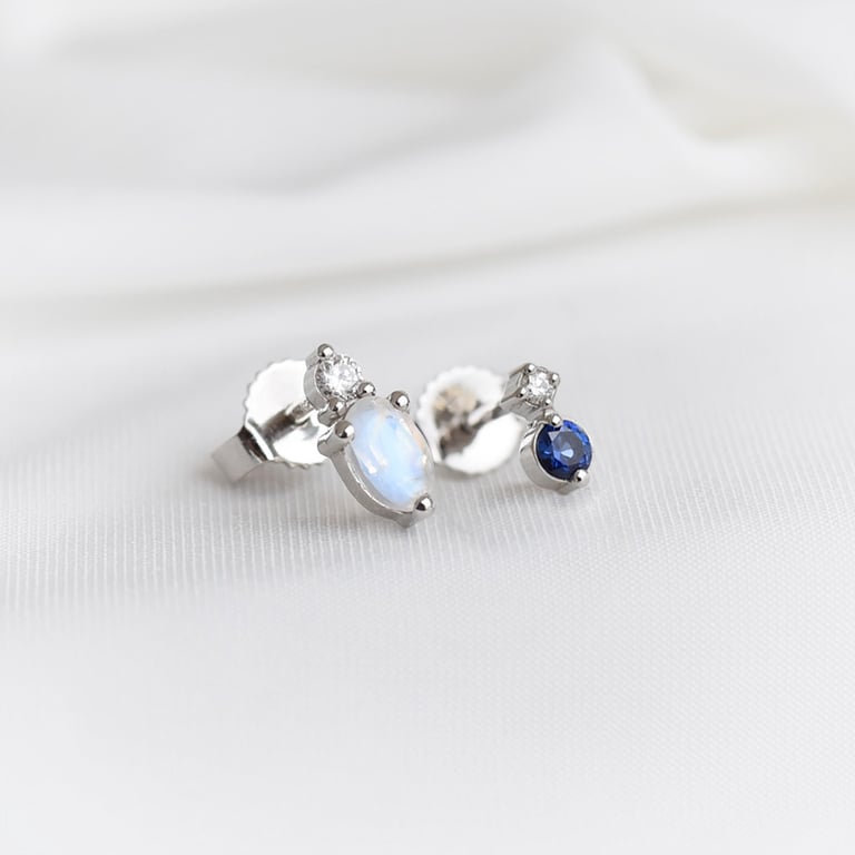 • die Ohrringe werden von Diamanten geschmückt, die mit ovalem Mondstein oder dunkelblauem Saphir verbunden sind