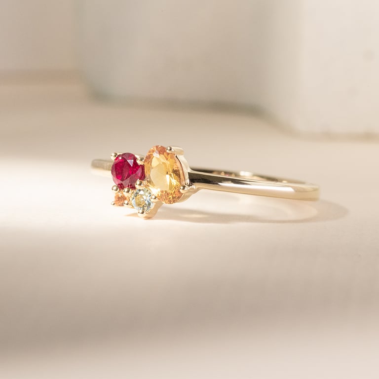 Cluster-Ring mit Citrin, Rubin und Aquamarin Bluma