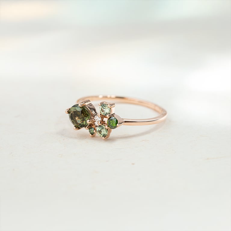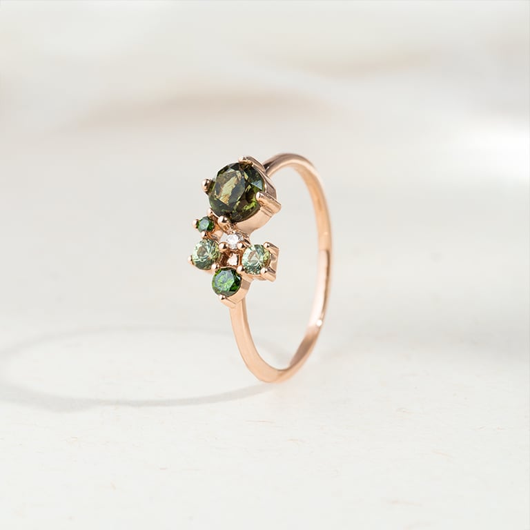 Cluster Ring mit Moldaviten, Saphiren und Diamanten Irma