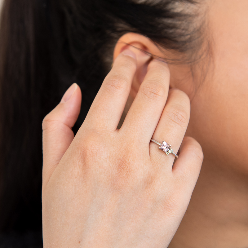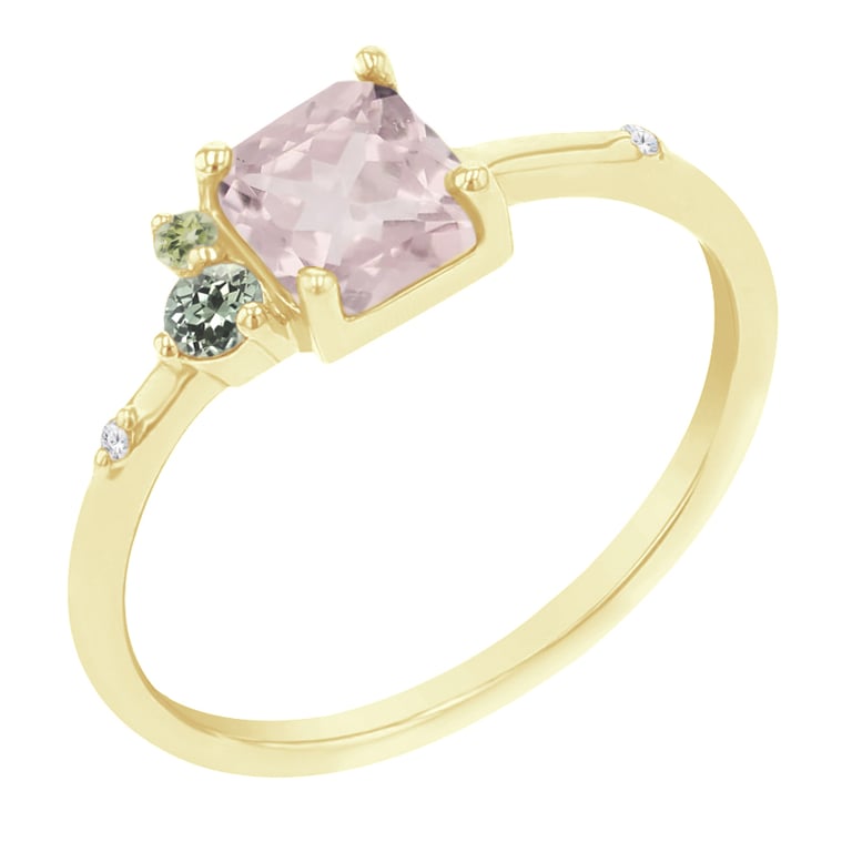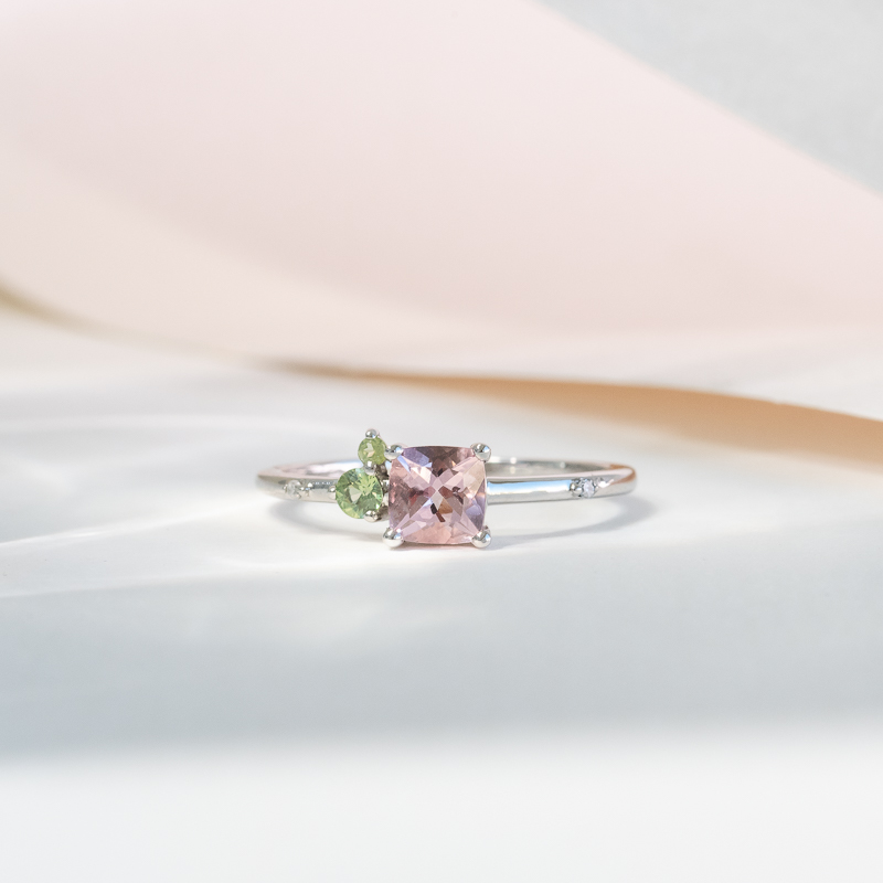 • eine frische Kombination aus rosa Morganit, grünem Saphir, Olivin und zwei Diamanten