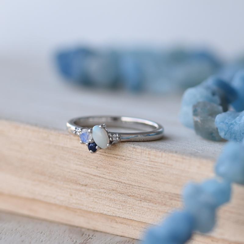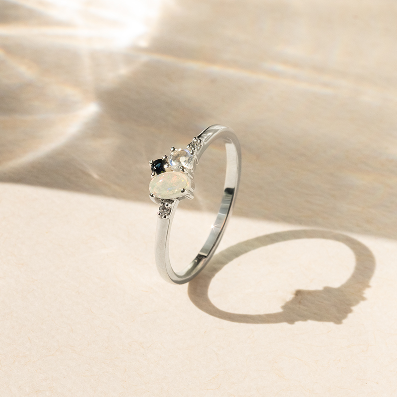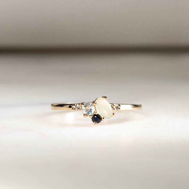 Cluster-Ring mit Opal, Saphir, Mondstein und Diamanten Elsa