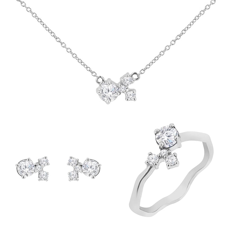 • perfekt aufeinander abgestimmtes Set aus drei Schmuckstücken im Cluster-Stil, der zur Zeit an der Spitze der Schmucktrends steht