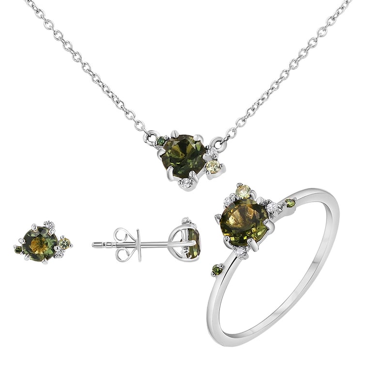 Cluster Schmuckset mit Moldavit, Saphir und Diamanten Odette