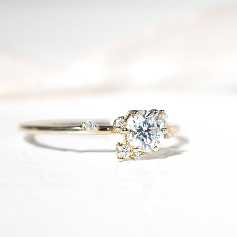 • ein himmlisch funkelnder Ring mit im Labor gefertigten Diamanten, deren Anordnung der Form einer Weintraube ähnelt