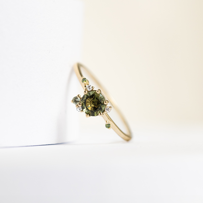 Cluster Verlobungsring mit Moldavit, Saphir und Diamanten Rosa
