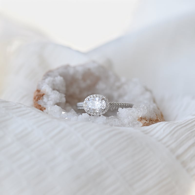 • dieser Haloring ist ein Juwel mit einem 0.75 ct ovalen Diamanten umgeben von einem Diamantenmeer
