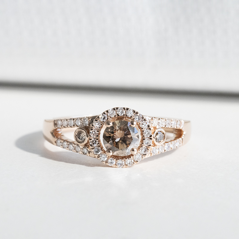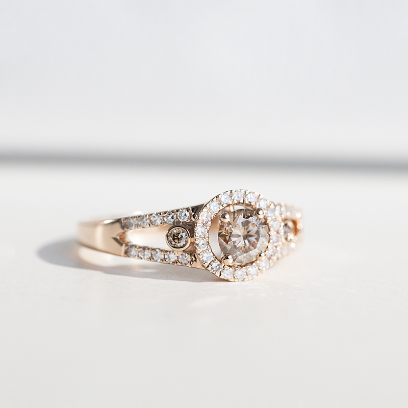 • in der Kombination mit Roségold ergeben sich durch die klaren und champagnerfarbenen Diamanten spannende Kontraste