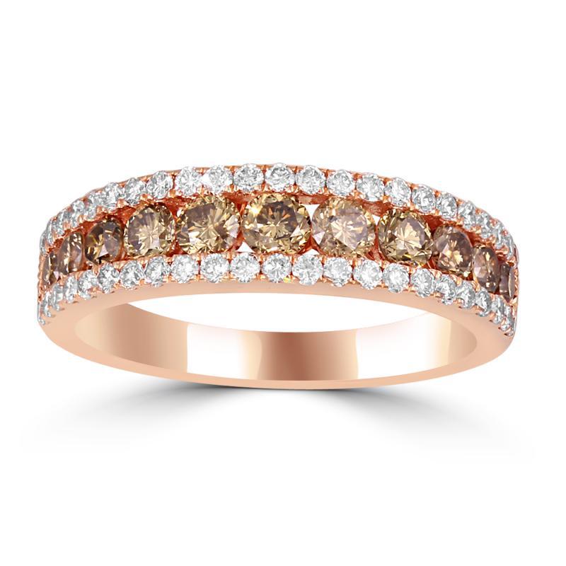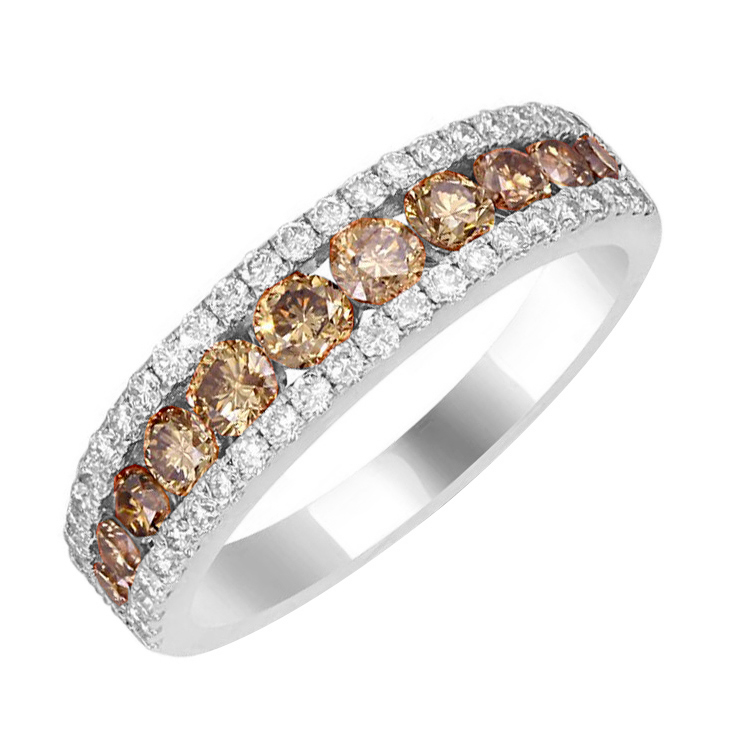 • die großen, champagnerfarbenen Diamanten werden von zwei mit weißen Diamanten besetzten Bändern eingesäumt