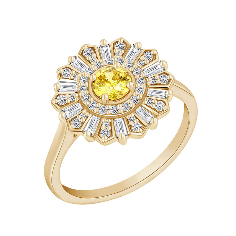 • ein seltener gelber Saphir wird von diamantenen Blütenblättern umrahmt
