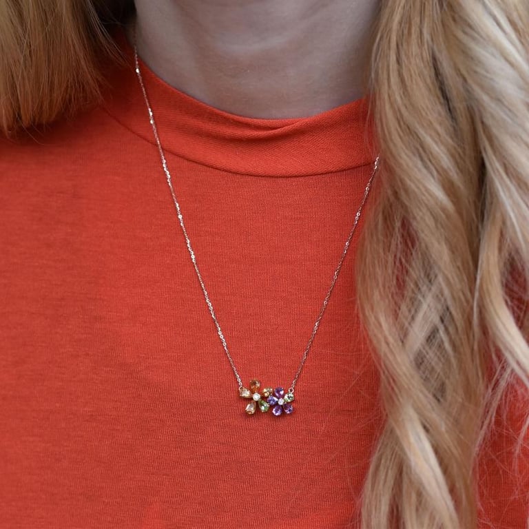 • goldene Halskette mit zwei Blumen aus farbigen Edelsteinen