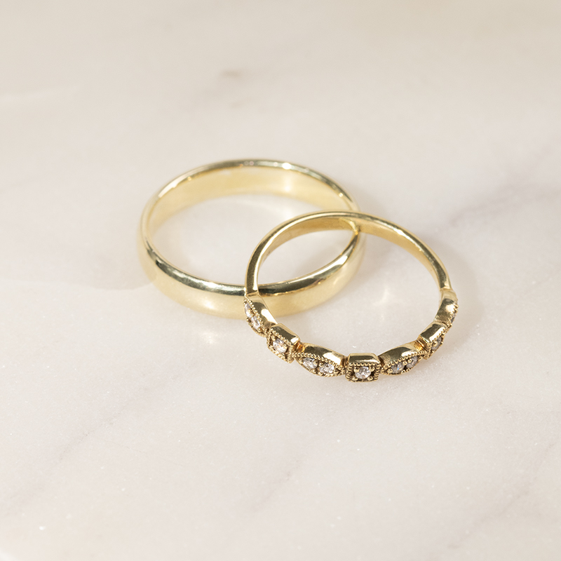 Eheringe aus einem Vintage-Ring mit Lab Grown Diamanten und einem Komfort-Ring Hadya
