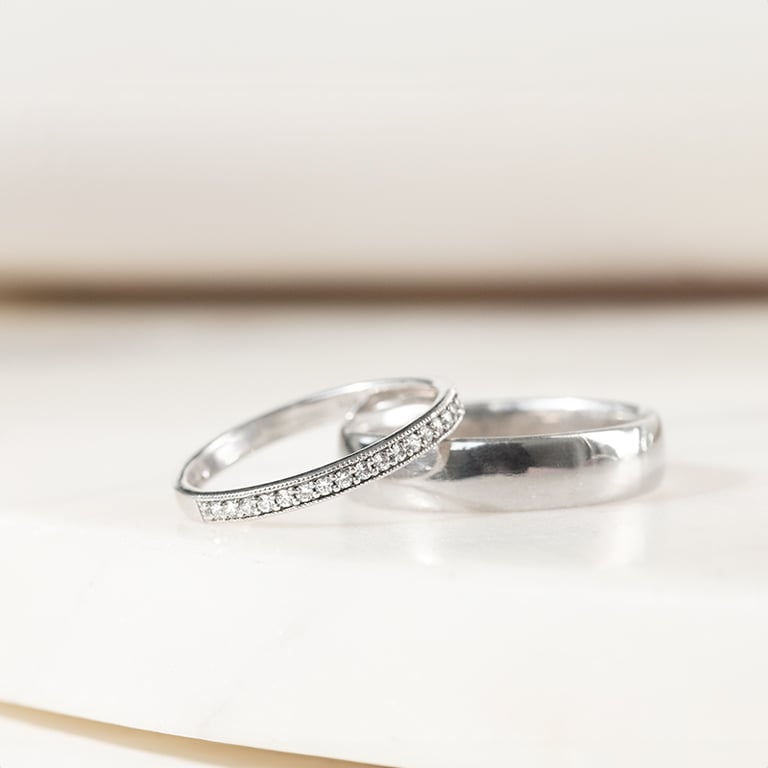 • ein Paar Trauringe aus recyceltem Weiß-, Gelb- oder Roségold