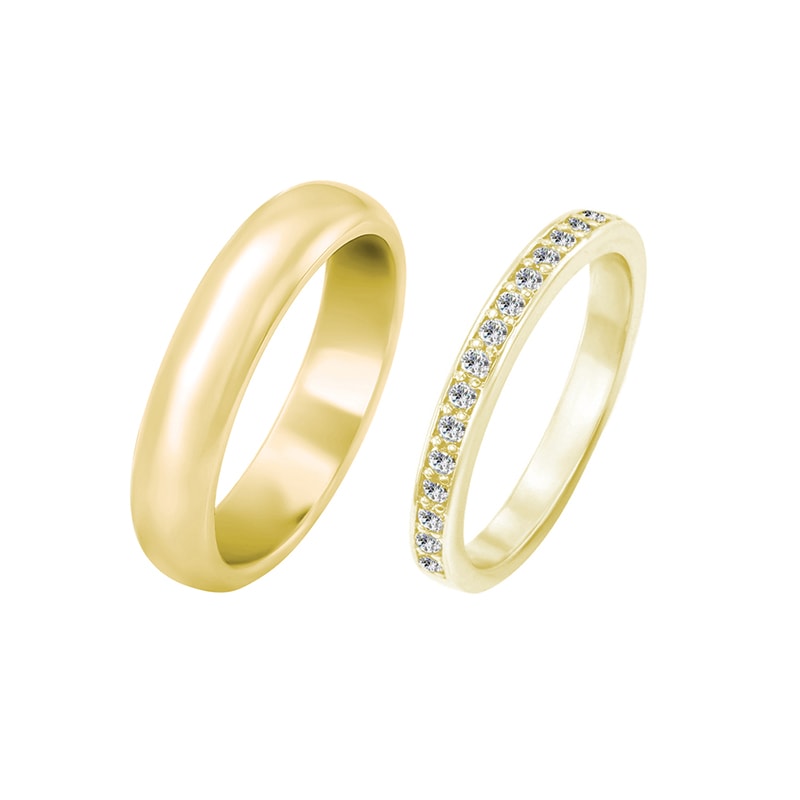 Eheringe aus Eternity-Ring mit Lab Grown Diamanten und einem breiten halbrunden Ring Zyte