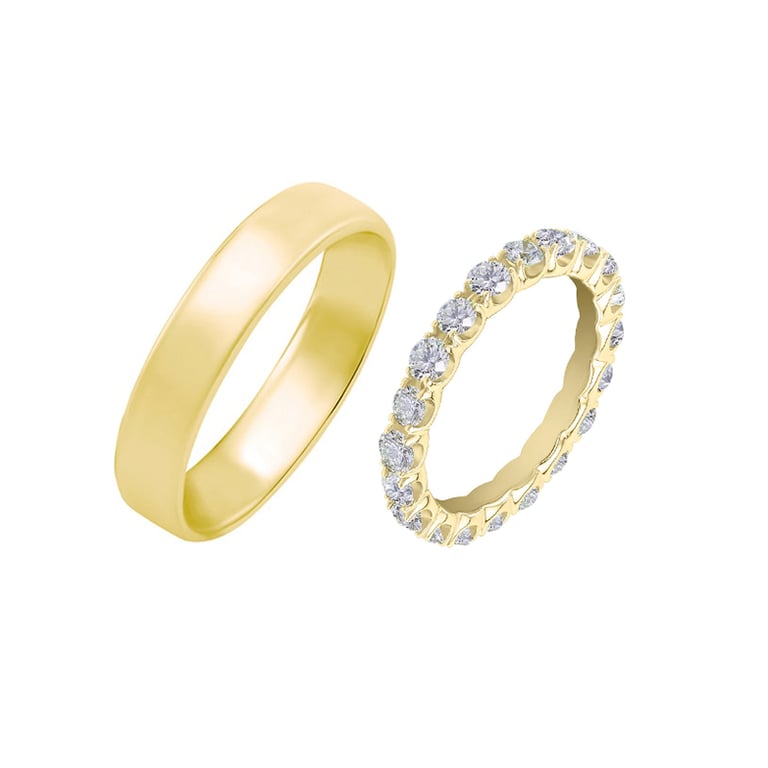 • ein Paar Eheringe, das den Glanz von recyceltem Gold mit dem Funkeln von Lab Grown Diamanten kombiniert