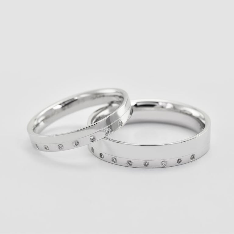 • Eheringe aus Gold mit einer Reihe von Diamanten