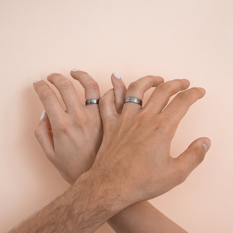 • zwei Eheringe aus Titan, die wunderbar zusammenpassen, genau wie Sie beide