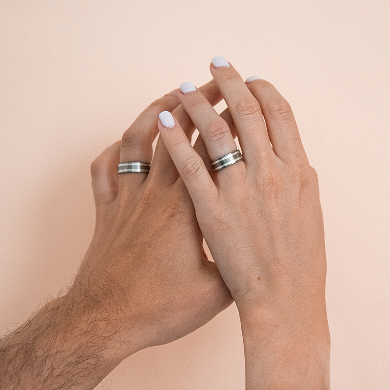 • die flachen Eheringe aus hypoallergem Titan schmücken zwei goldene Bänder