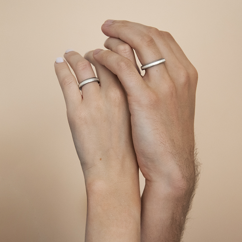 • originelle Eheringe aus Titan, beide Ringe sind mit einem raffinierten Silberband verziert