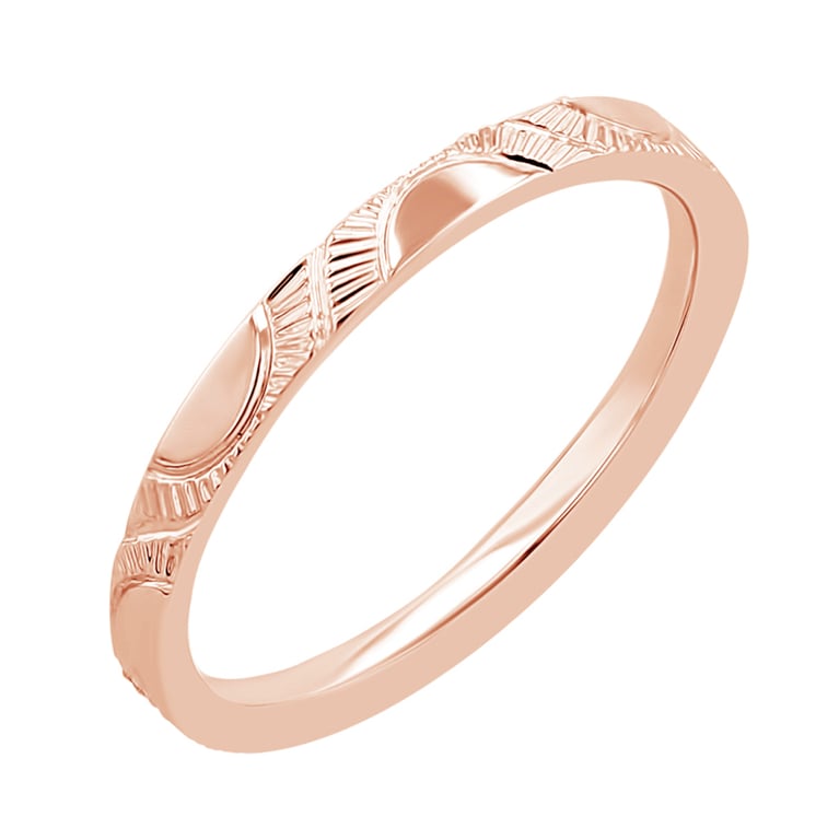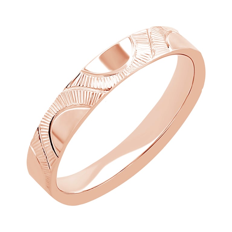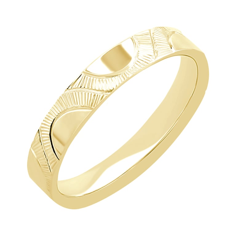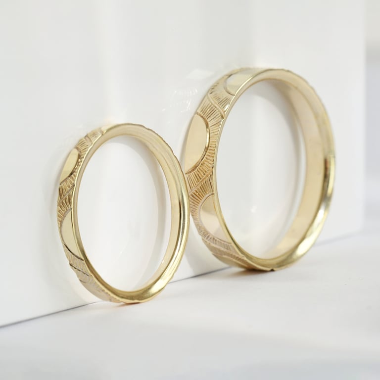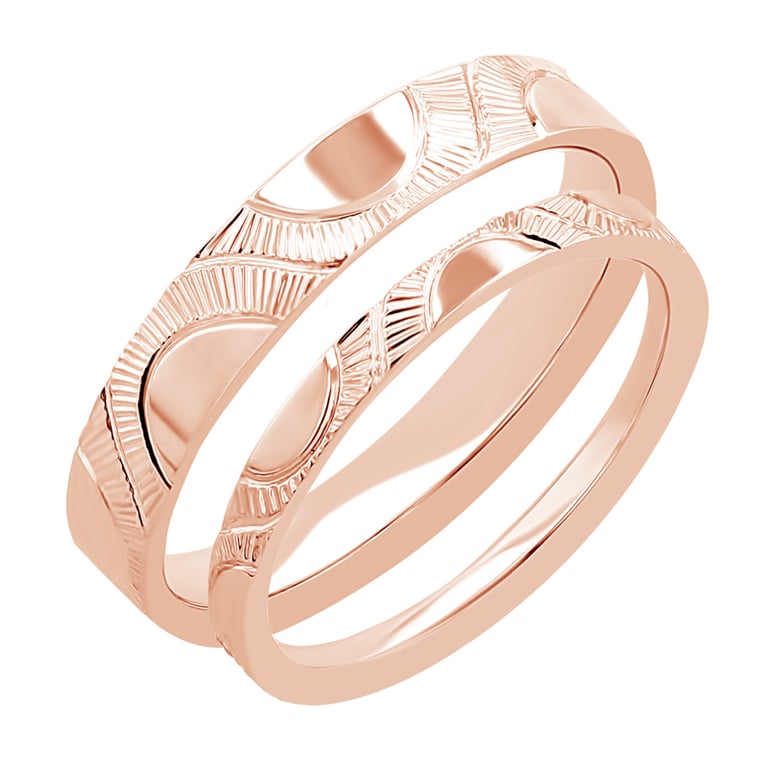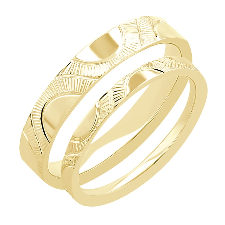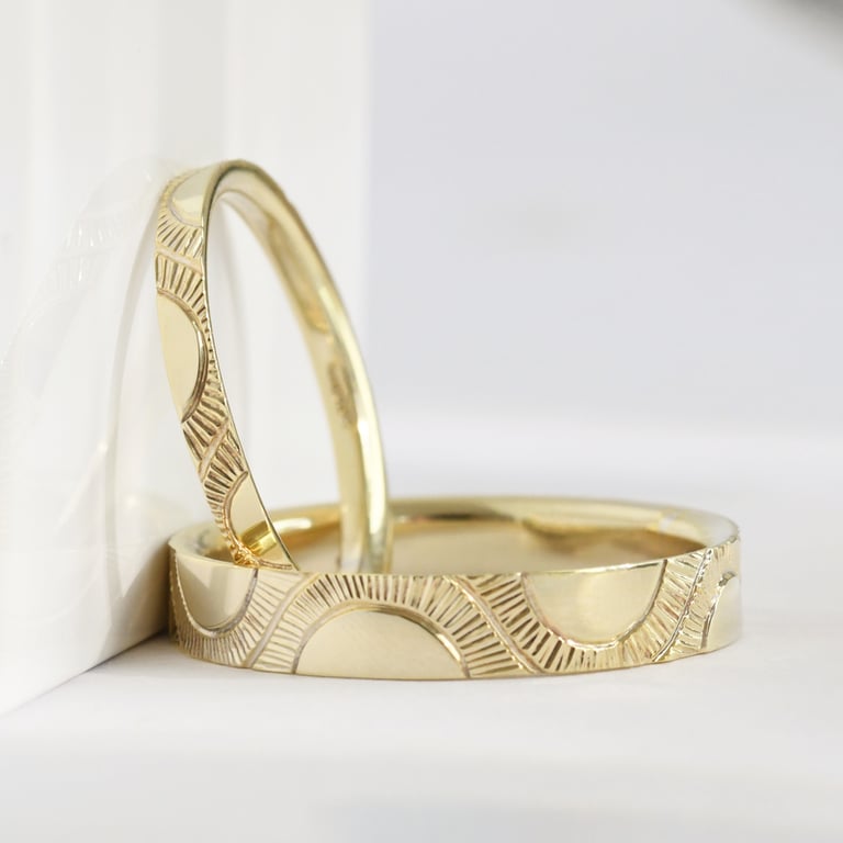 • Eheringe mit eingravierten Sonnenstrahlen, die ein Symbol des Lebens und des Neubeginns sind