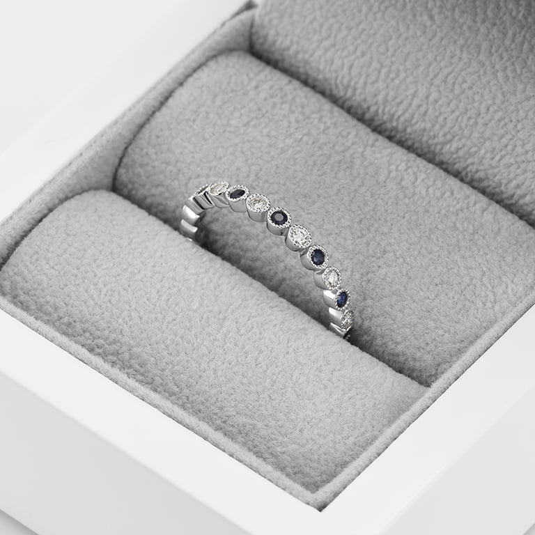 • die Diamanten und Saphire verleihen dem Ring der Braut eine Note von Luxus