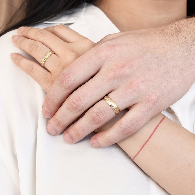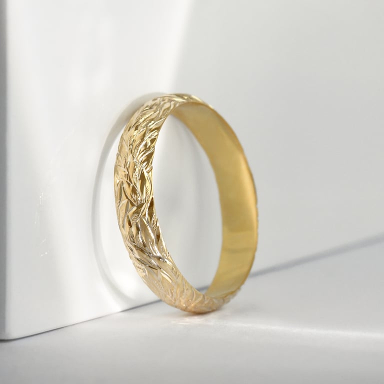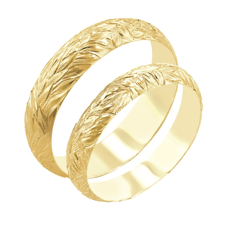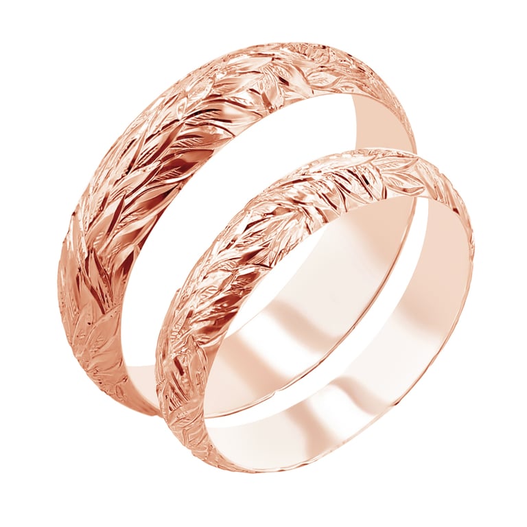 • wunderschöne Eheringe, deren Oberfläche mit präzise geformten Blättern verziert ist