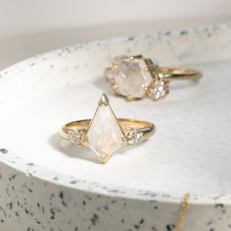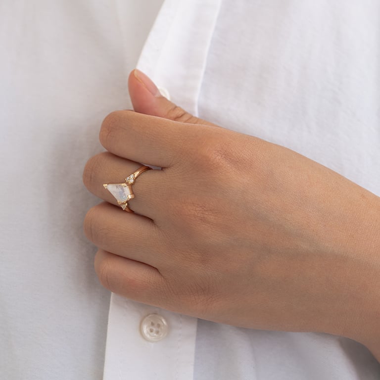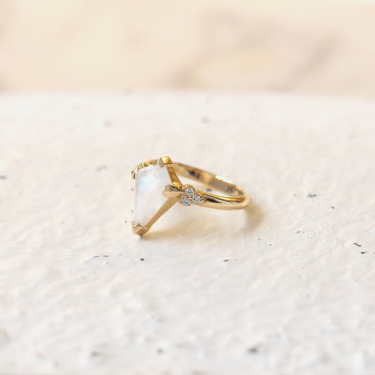 • atemberaubender Ring, dominiert von einem natürlichen Mondstein in der originellen Kite-Form