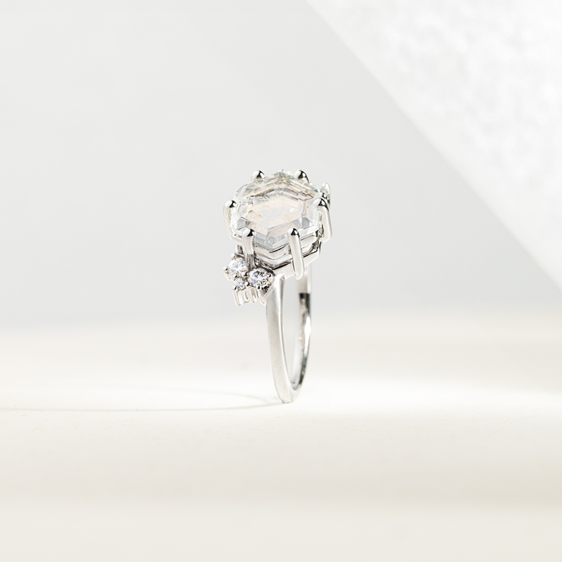 • unregelmäßig angeordnete seitliche Moissanite verleihen dem Schmuckstück einen einzigartigen Charme
