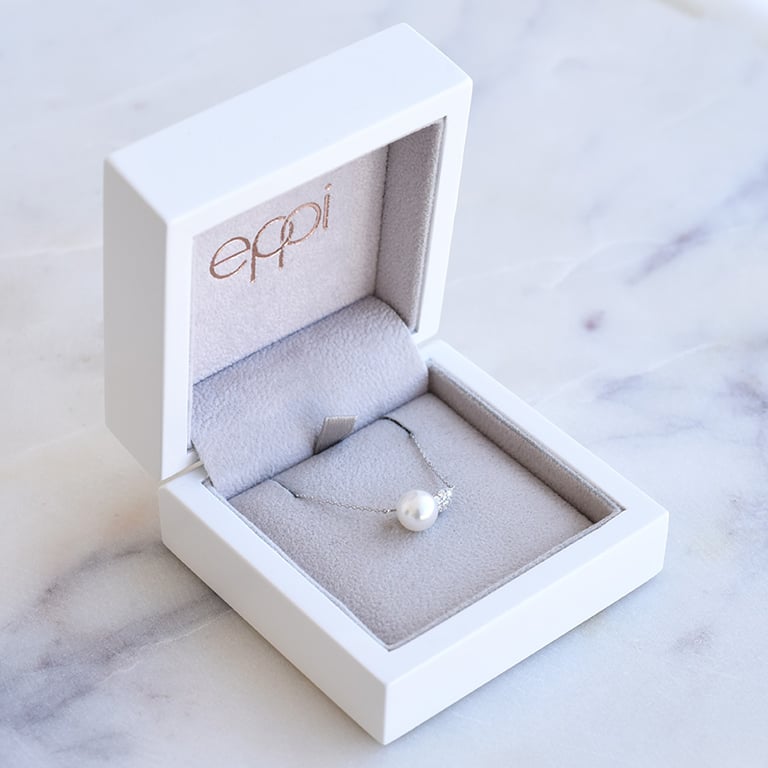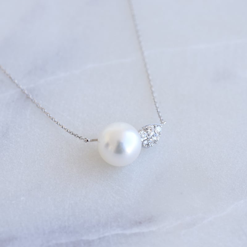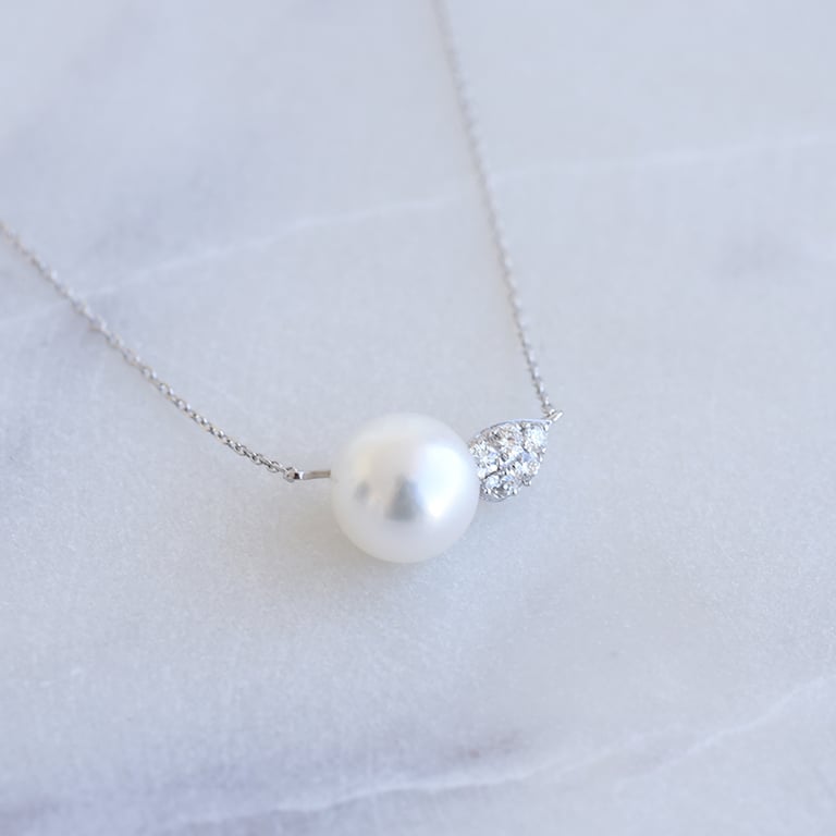 • die weiße Perle wird von einem Quintett aus Diamanten in Blattform ergänzt