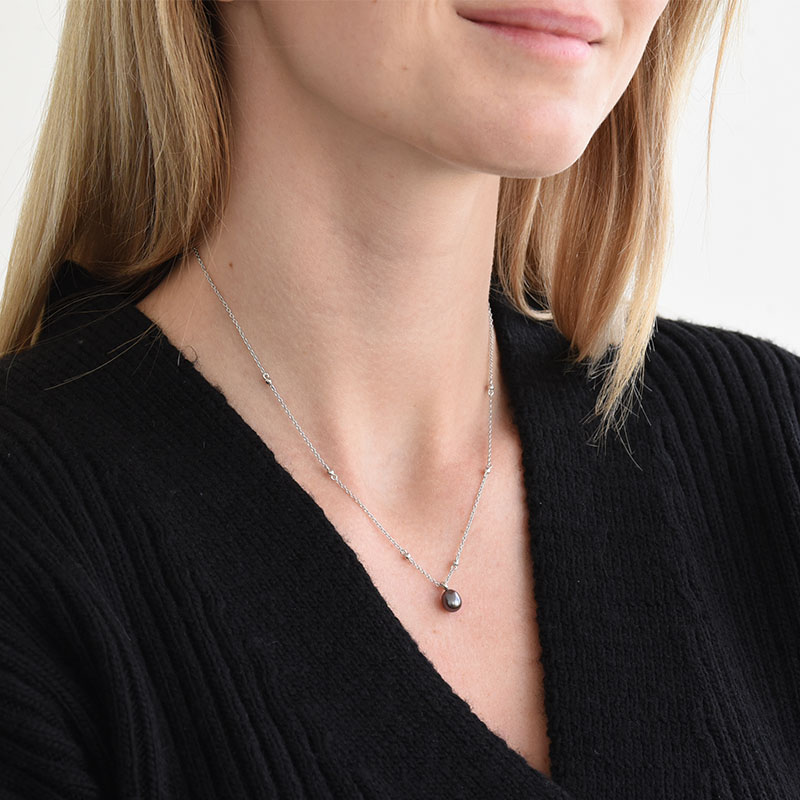 • eine schwarze Perle und kleine silberne Perlen in zarter Kette