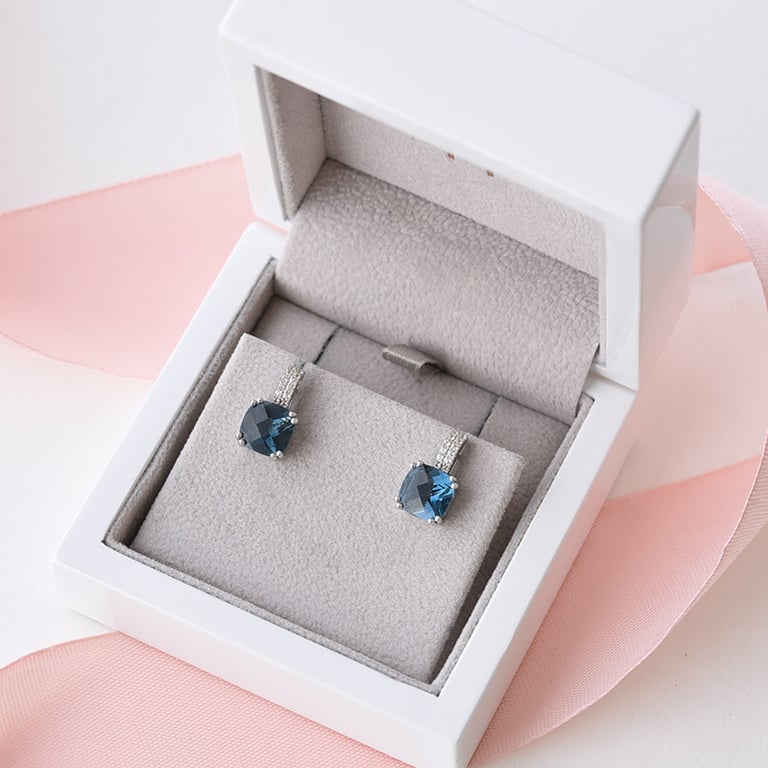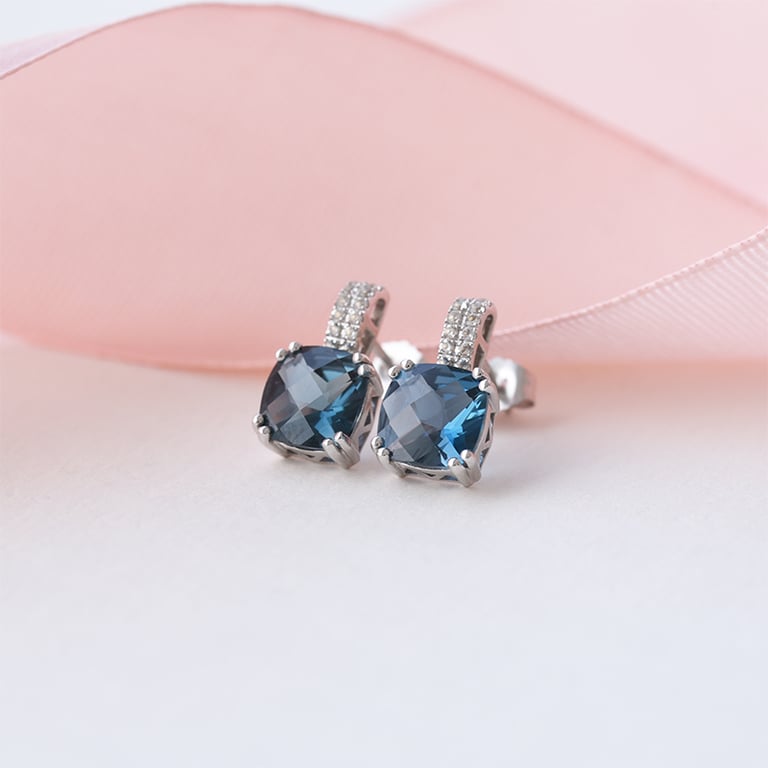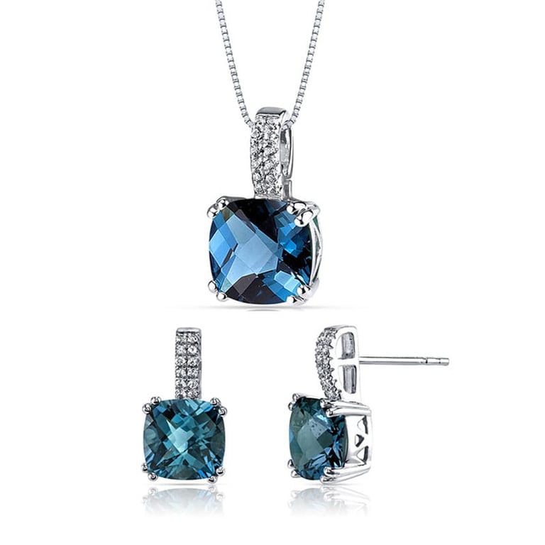 • dieses Schmuckset in kühlem Weißgold beeindruckt mit Cushionschliff Topasen in dunklem Londonblau