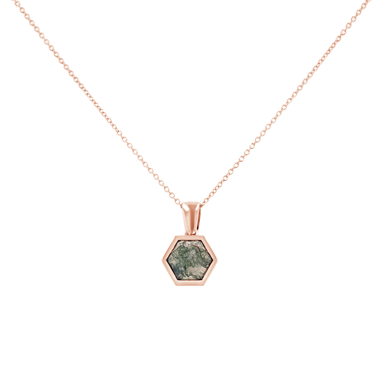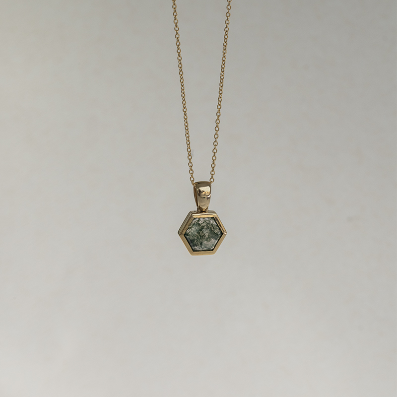 • der zentrale Moosachat sieht aus wie ein Tautropfen auf einem Waldboden