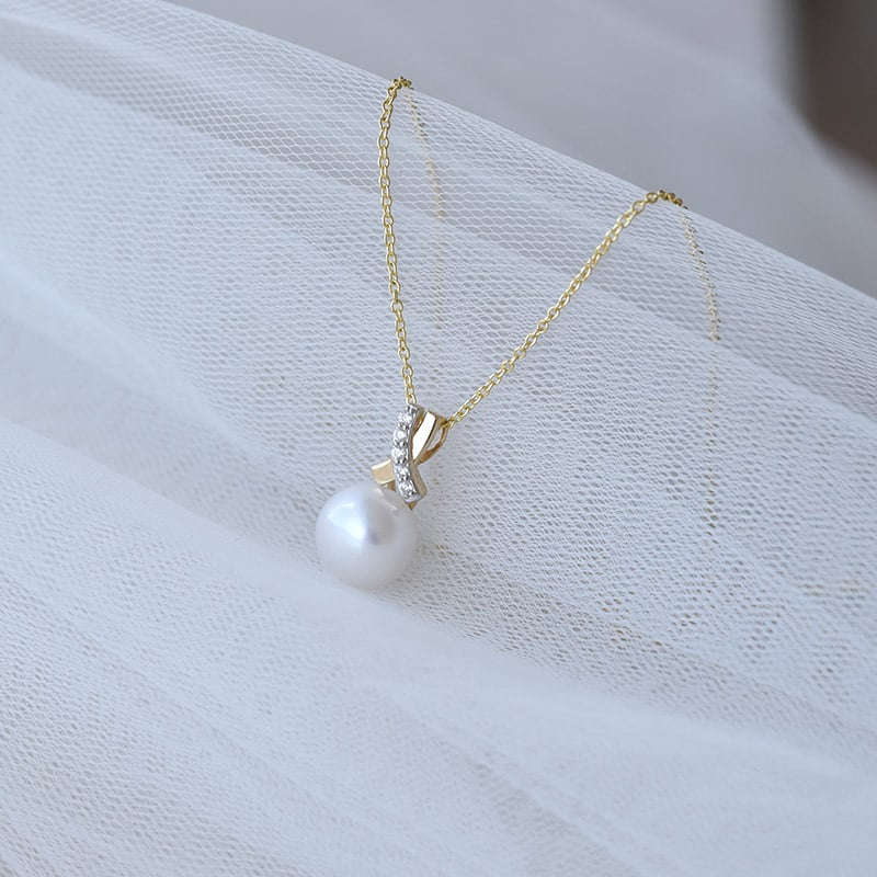 • eine perfekt runde Perle wird von einer gekreuzten mit Zirkonen besetzten Öse aus Gelbgold sicher gehalten