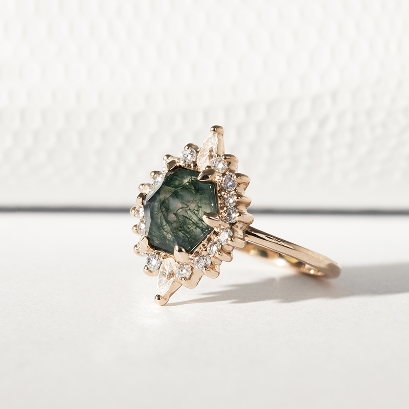 Eleganter Ring mit Moosachat und Moissaniten Melia