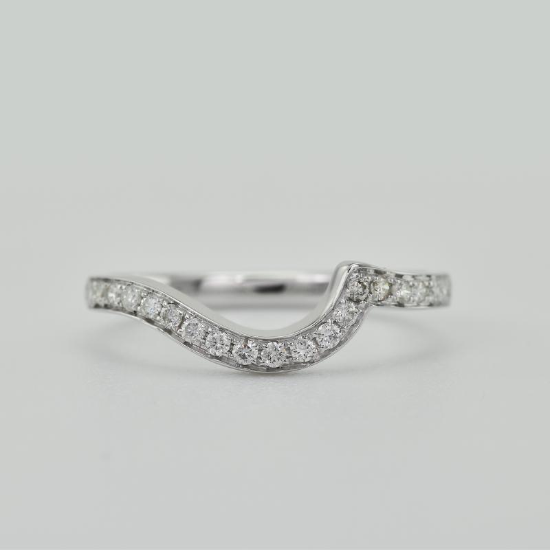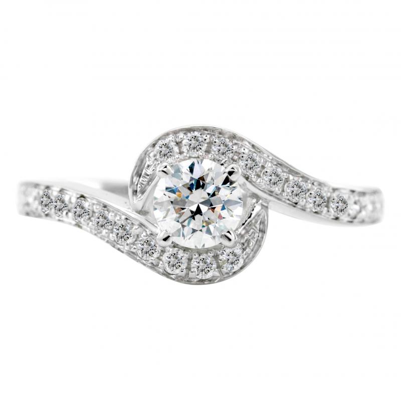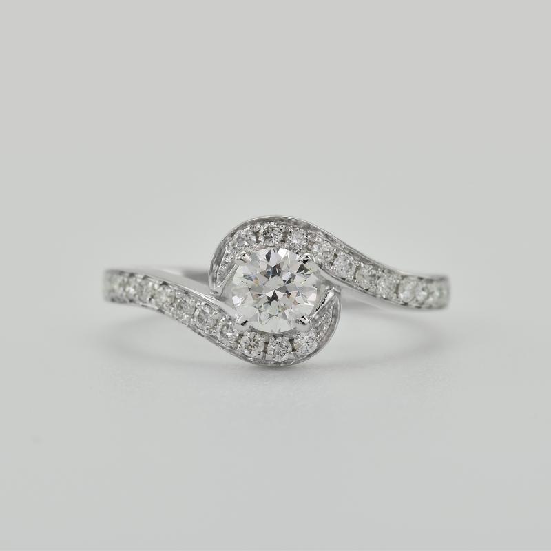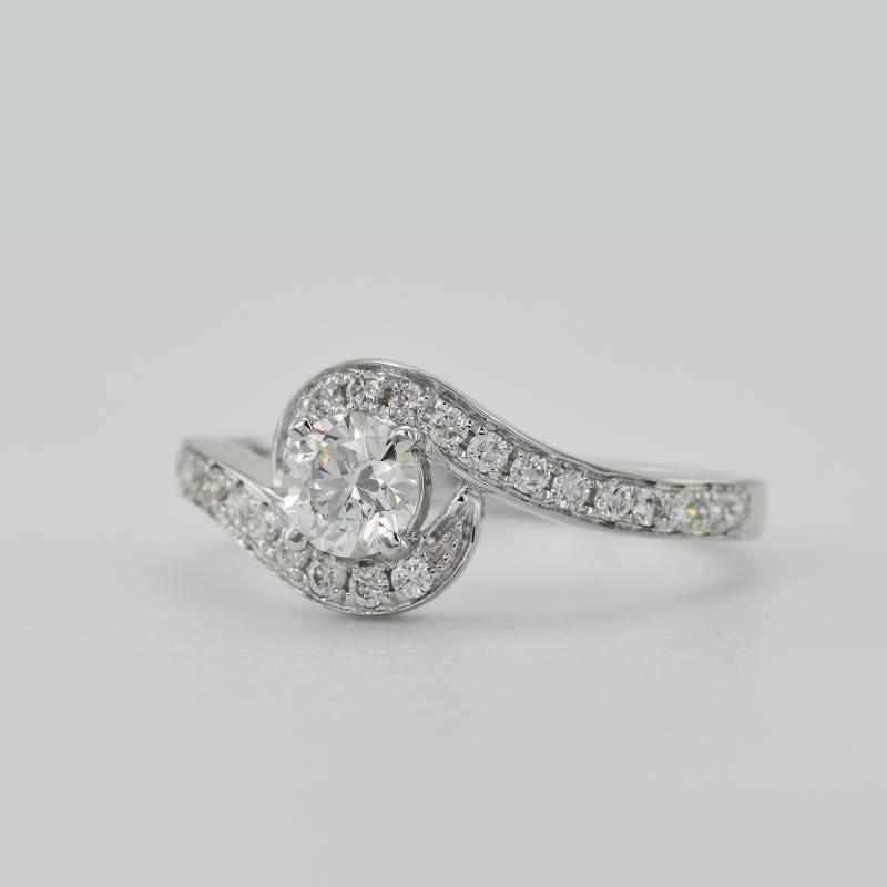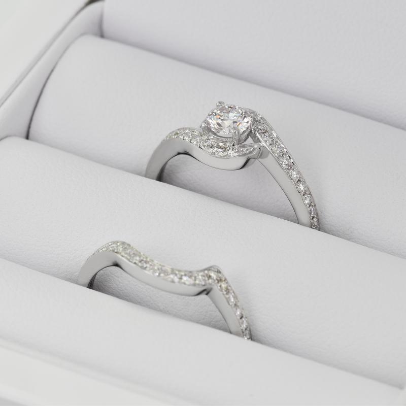 • in einem verschlungenen Band, das mit Diamanten übersät ist, sitzt ein 0,33 Karat großer Diamant