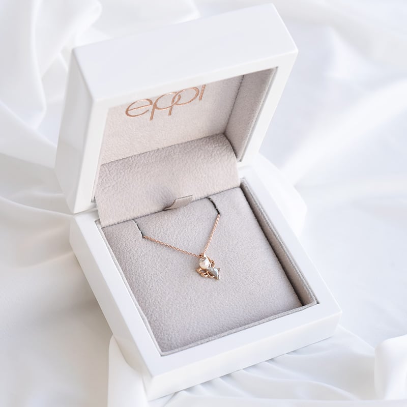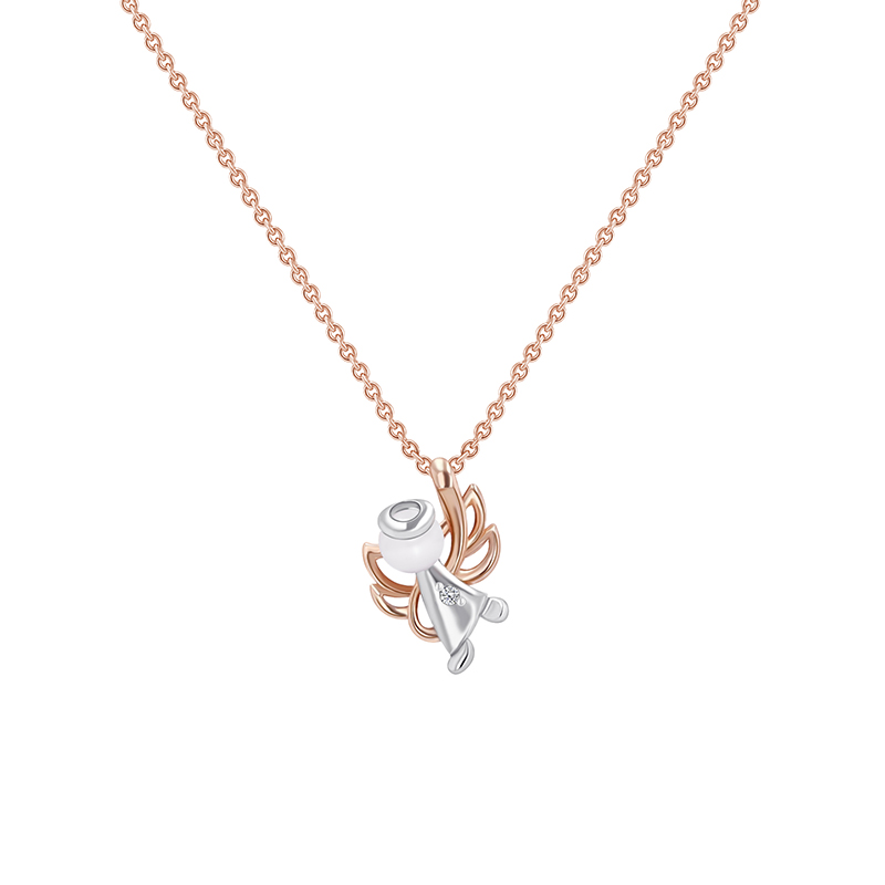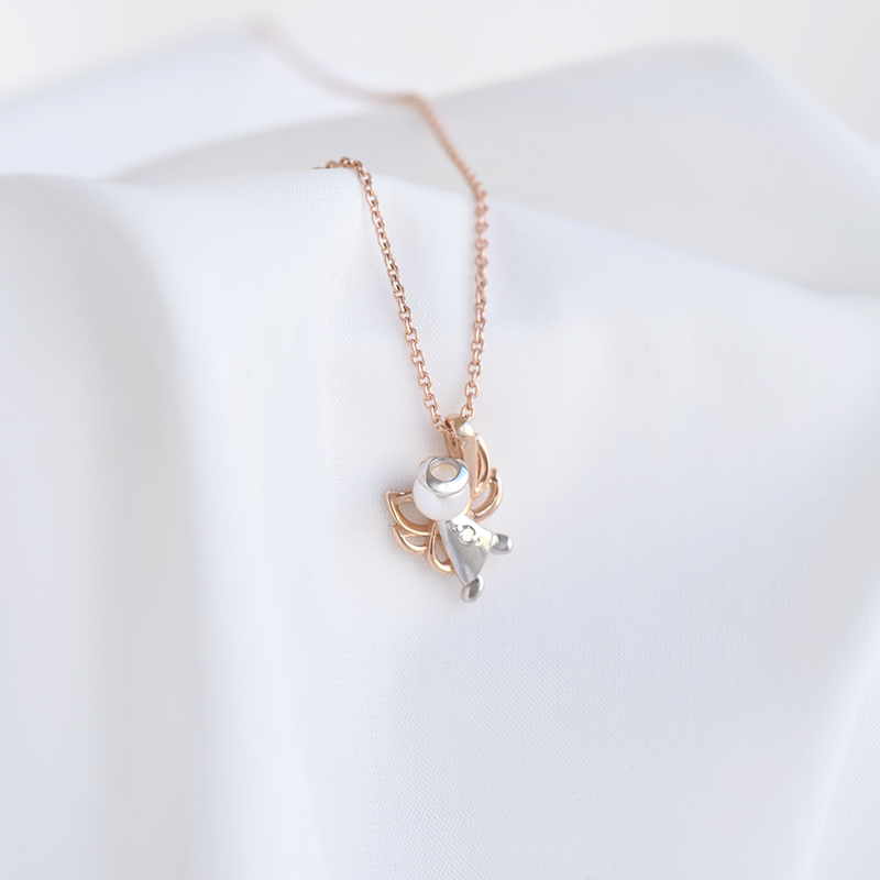 • diese Kombination von Weiß- und Roségold mit einer Perle und einem Diamanten in einem kleinen Engel ist sehr effektvoll