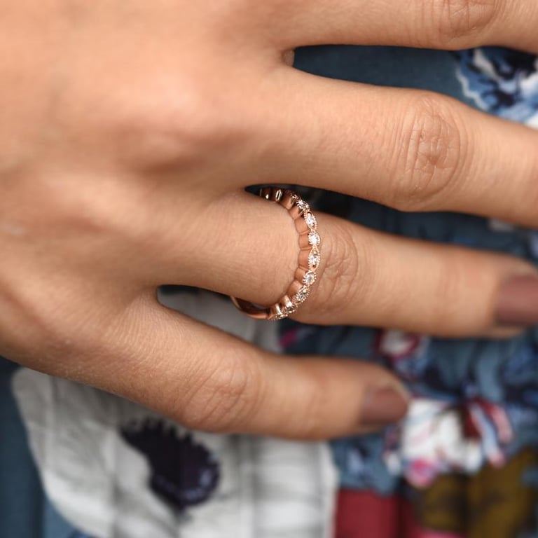 • ein schmaler Ring mit funkelnden Diamanten in abwechselnd ovaler und runder Fassung sowie ein klassischer Ring