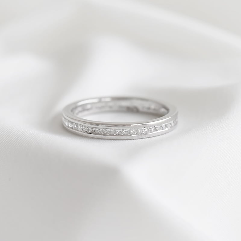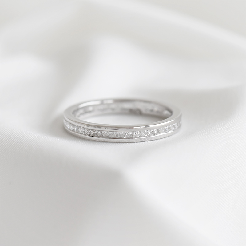 • ein mit 48 Lab Grown Diamanten besetzter Eternity-Ring in Gold oder Platin