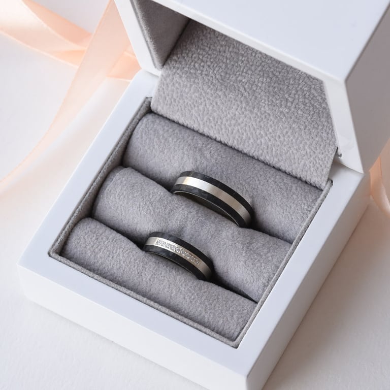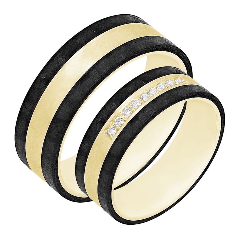 Flache Trauringe aus Carbon und Gold mit Diamanten Moserah