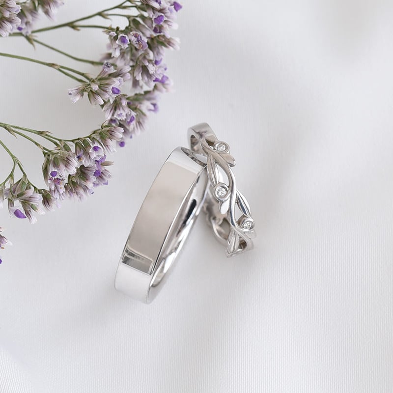 Floraler Damenring mit Diamanten und dezenter Herrenring Emery