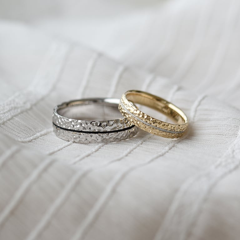 • individualistische Hammerschlag-Eheringe mit schmalem Emailstreifen