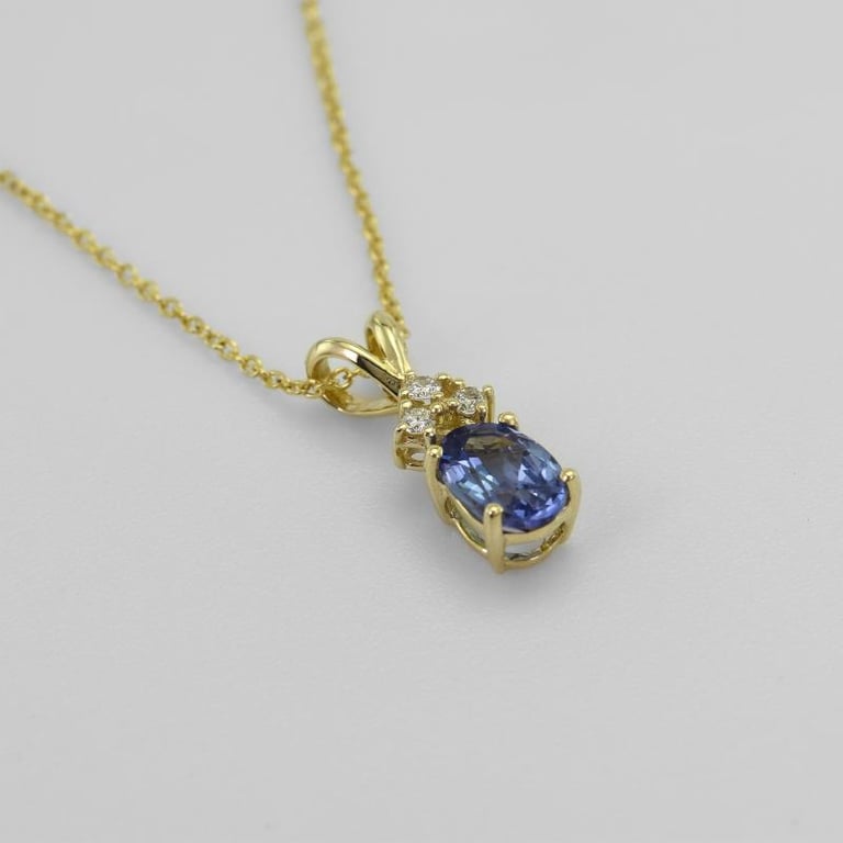 • eleganter goldener Anhänger mit ovalem Tansanit und drei Diamanten