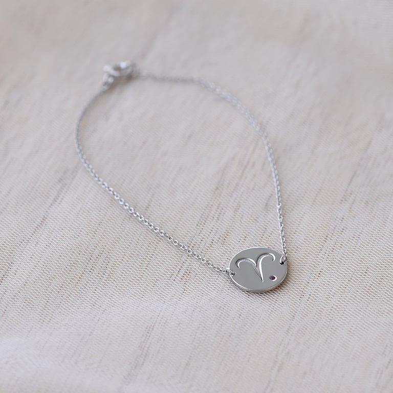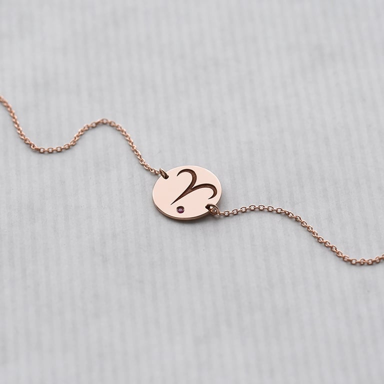 • das goldene Armband wird vom Zeichen des Widders und einem roten Rubin, dem Geburtsstein des Zeichens, geschmückt
