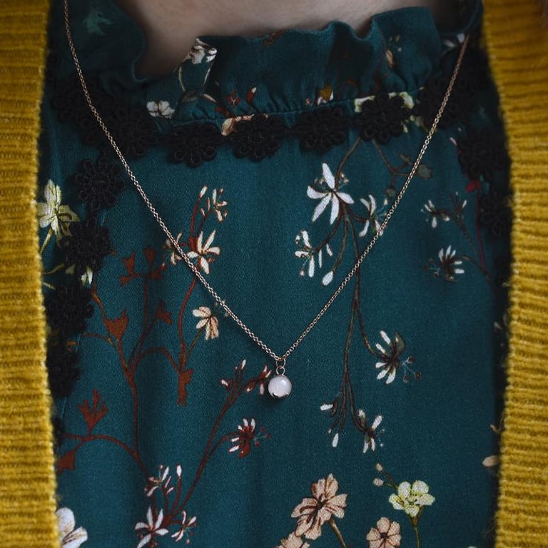 • bei dieser Goldkette ist ein eleganter Cabochon mit Rosenquarz und zarten Goldblättchen ein absoluter Blickfang