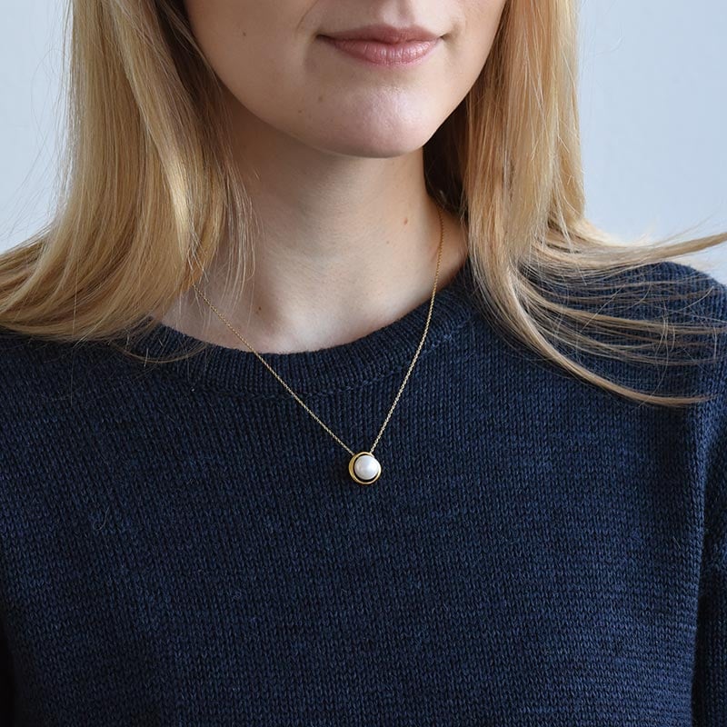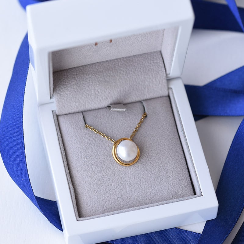 • die Perle strahlt in einer goldenen Durchführung der Halskette